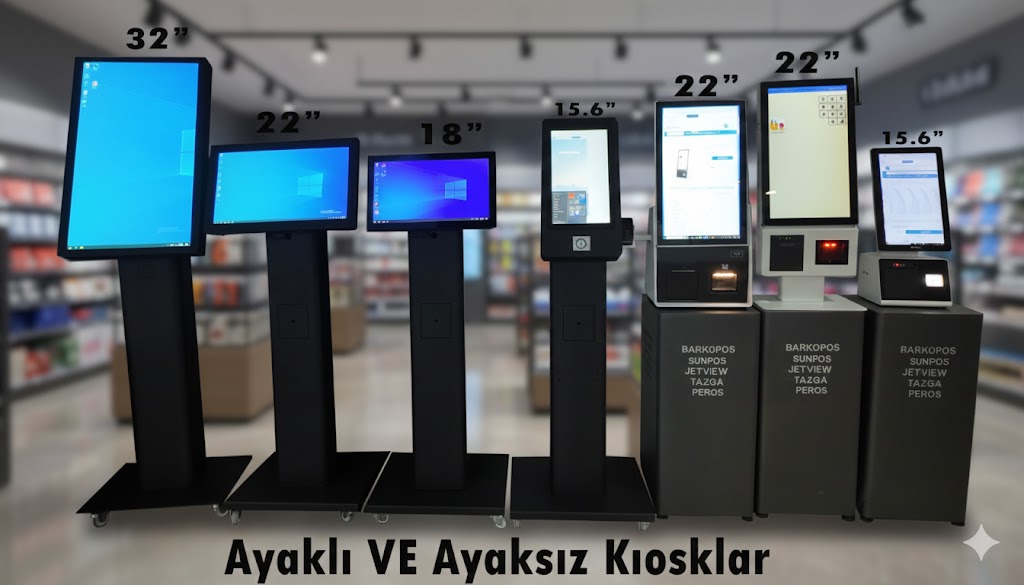 Farklı ekran boyutları, güçlü donanım ve şık tasarım ile self-servis çözümleriniz için ideal kiosk sistemleri.