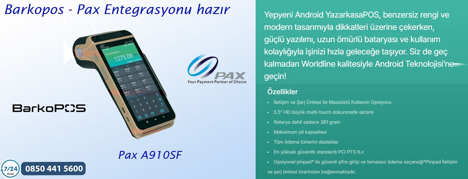Temassız (NFC), manyetik şerit ve çipli kart okuyucu ile kredi/banka kartı ödemelerini kabul eder.
